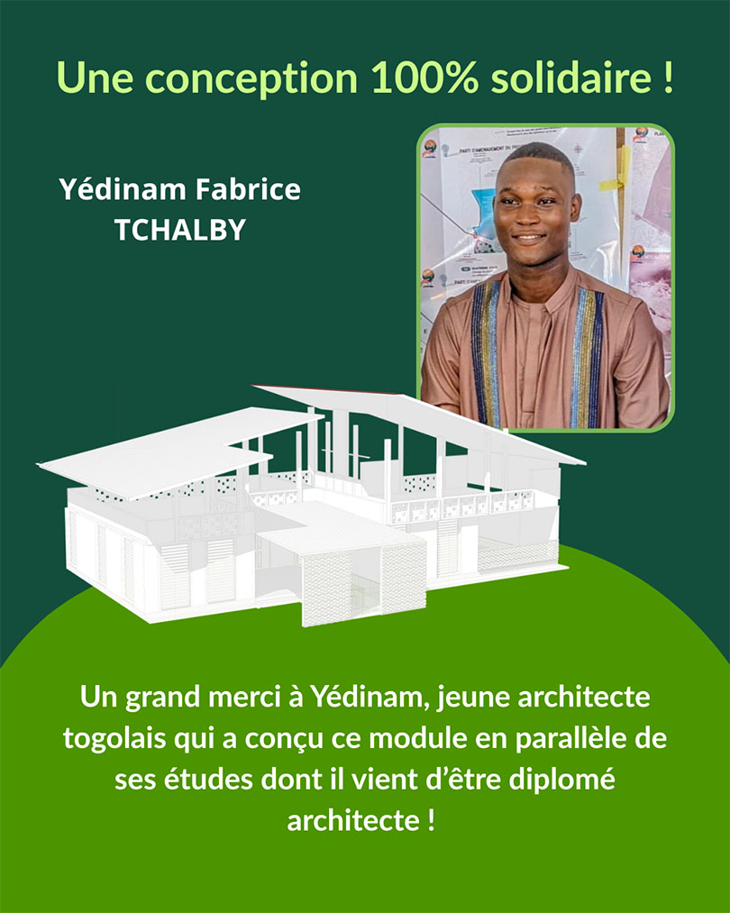 L'architecture de ce module a été entièrement conçue par Yedinam Tchably, un jeune architecte togolais qui a apporté son expertise au projet en parallèle de sa dernière année d’études.