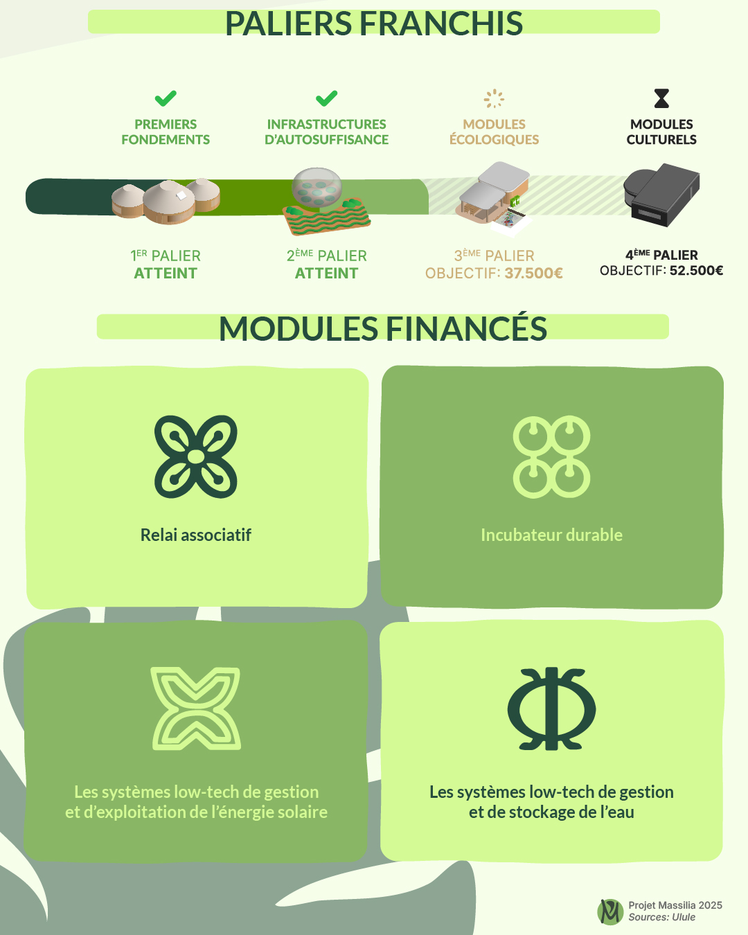 Le Projet Massilia a pour objectif de sensibiliser les communautés aux enjeux sociaux et environnementaux, de former des entrepreneurs aux pratiques durables et respectueuses de leur environnement, de préserver la biodiversité de la localité de chacun de ses centres, ou encore de construire des centres low-tech à partir de matériaux locaux et de les rendre autonomes en énergie et en eau.